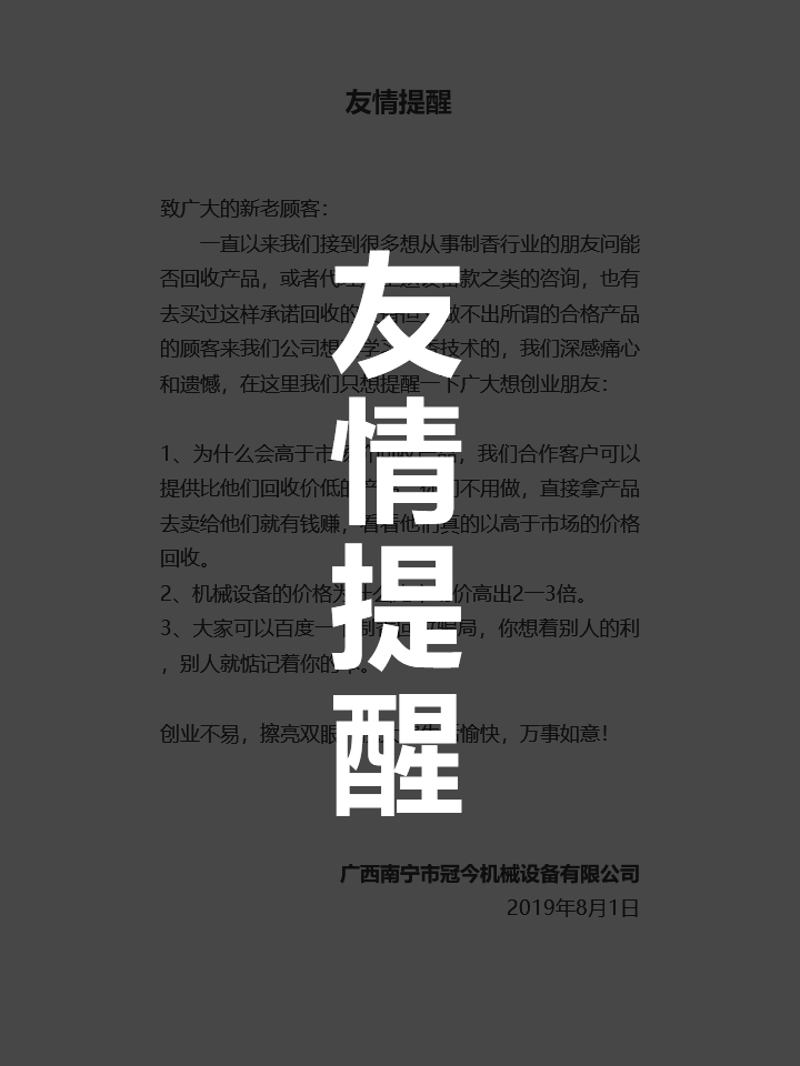 廣西南寧市冠今機械設備有限公司(原南寧市富利機械加工廠)是一家集制香機械設備開發(fā)設計、香品生產銷售于一體的科技企業(yè),引進國際先進技術所研究出來的制香機設備是可生產多種類型的衛(wèi)生香,檀香,竹簽香等。擁有大型香業(yè)基地及堅實的硬件基礎,在制香機械領域具有從研發(fā)到批量生產的全方位優(yōu)勢。